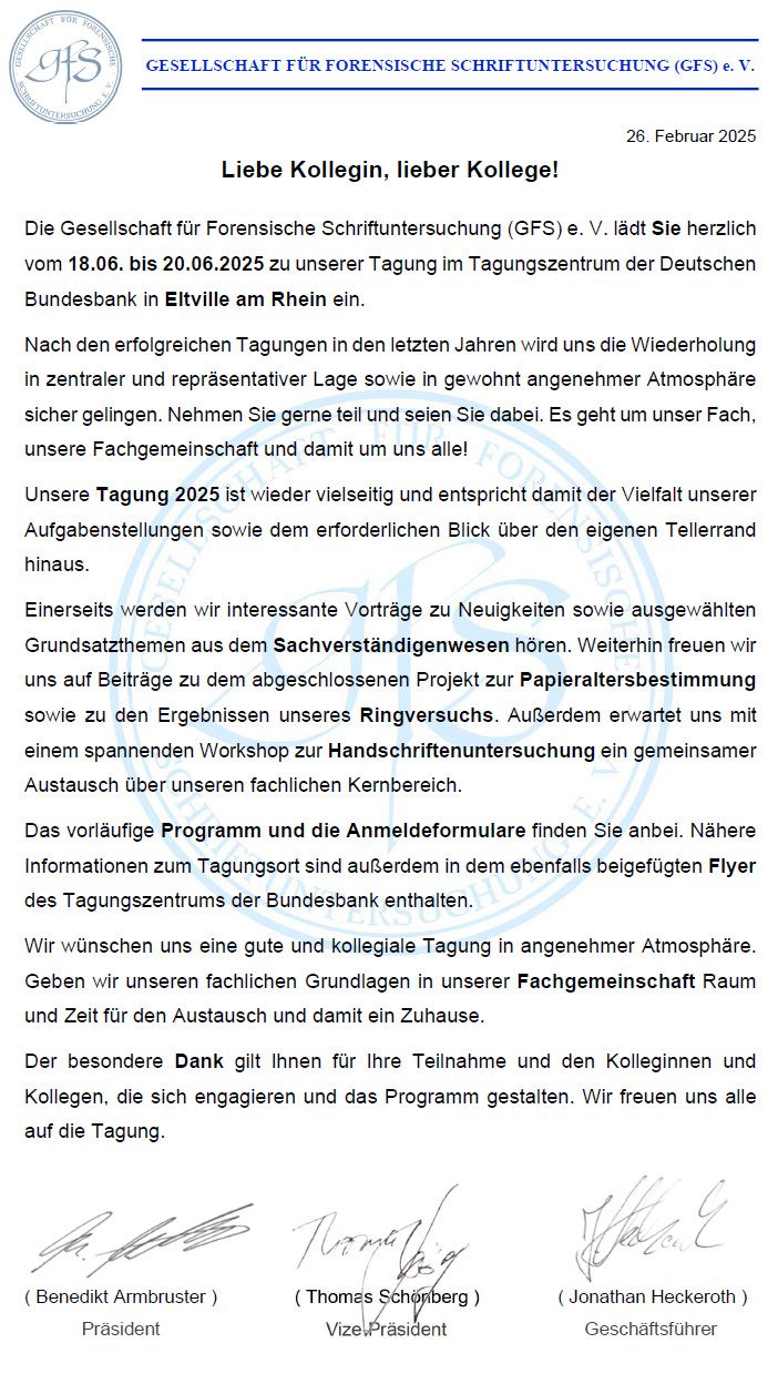 Die Tagung 2025 der Gesellschaft für Forensische Schriftuntersuchung (GFS) e.V. findet vom 16. Juni bis zum 20 Juni 2025 im Tagungszentrum der Deutschen Bundesbank in Eltville am Rhein statt.